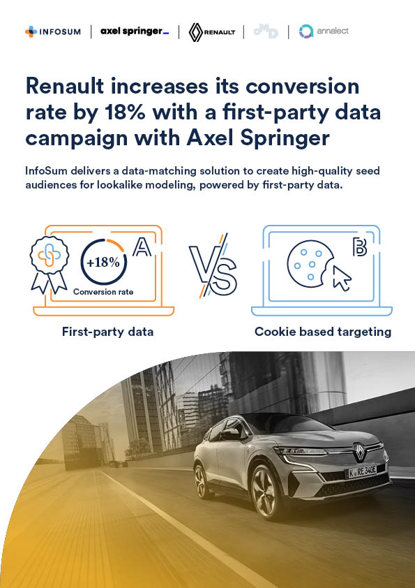 Using InfoSum’s clean room, Renault matched its CRM data with Axel Springer’s audience data without moving or sharing PII. A seed audience overlap was modeled into a lookalike audience within Axel Springer’s DMP. This campaign ran in parallel with a cookie-based control, proving the effectiveness of first-party data collaboration at scale.